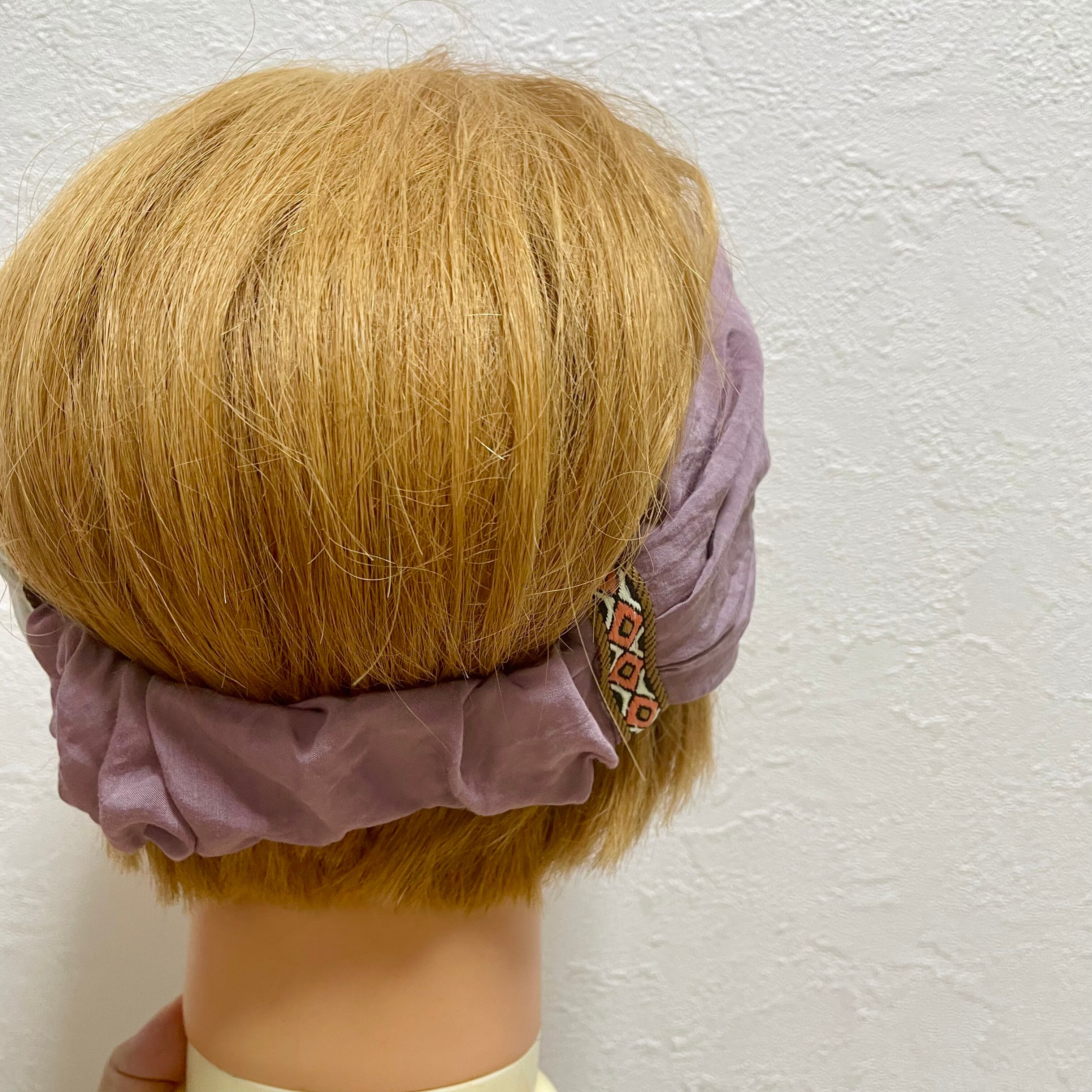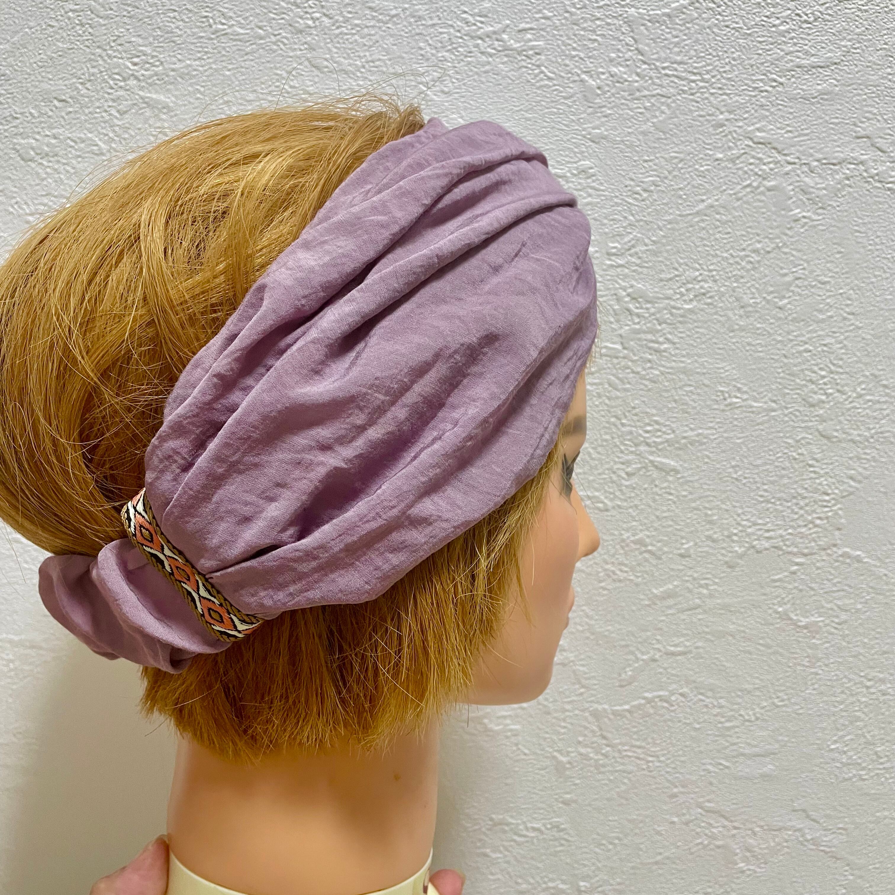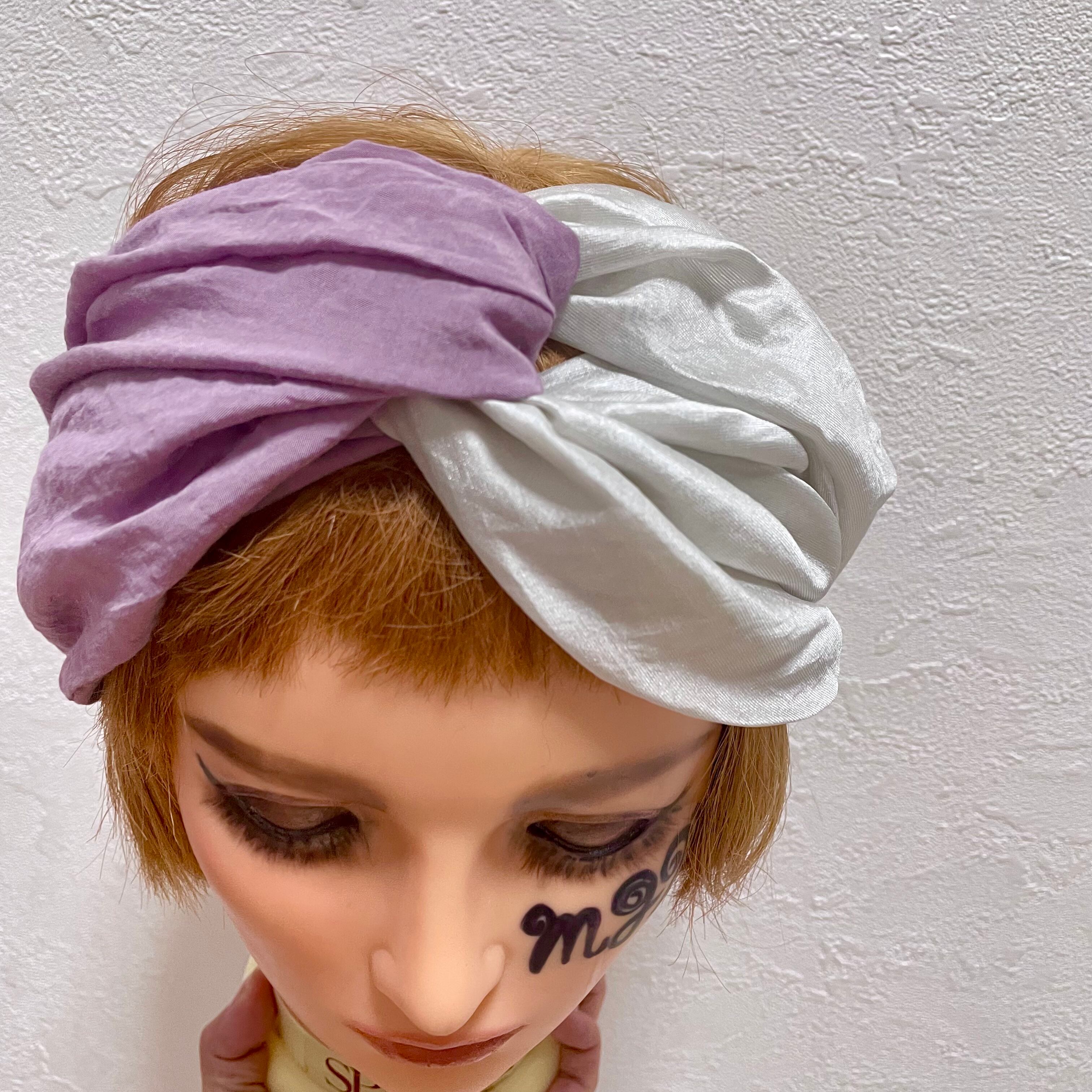 くすみパープルとシルバーホワイトの柔らかなヘアバンド。